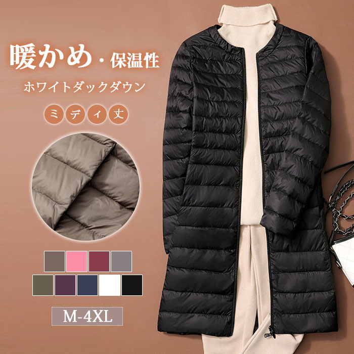 ダウンコート 軽量 ロング丈 ロングコート ホワイトダックダウン ダブルファスナーポケット ノーカラーコート チェスターコート アウター BIGコート レディース 秋 羽織り ゆったり ボリュー 厚手