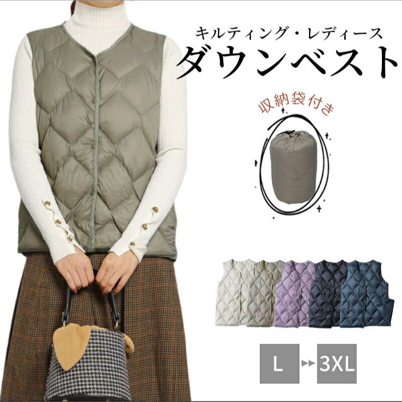 ダウンベスト ベスト インナーダウン レディース キルティングベスト ライトダウンベスト アウター 軽い 暖か 防寒 薄い コンパクト ショート丈 収納袋 ポーチ付き キルティング 定番 秋 冬 上着