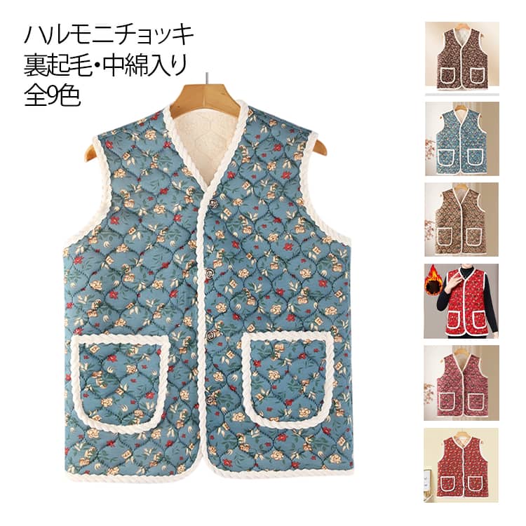ハルモニチョッキ おばあちゃん チョッキ 婦人 シニア ベスト レディース 中綿ベスト 裏起毛 裏ボア キルティング あったか アウター 前開き 防寒 保温 秋冬 ハルモニベスト ルームウェア 花柄