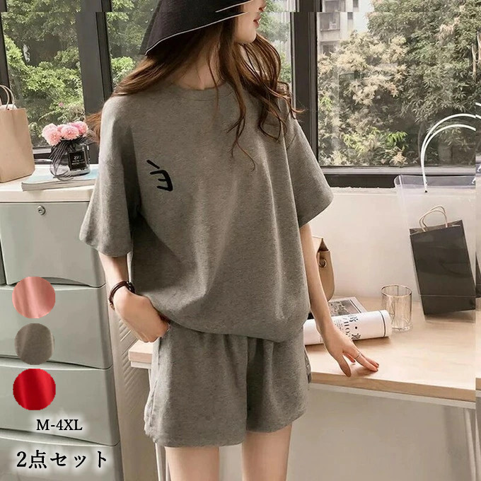 2点セット レディース 半袖Tシャツ+ショート丈パンツ 無地 刺繍 ワイドパンツ ゆったり 大きいサイズ オシャレ 着痩せ カジュアル 薄手 通勤 通学 ファッション 夏物 新作 運動