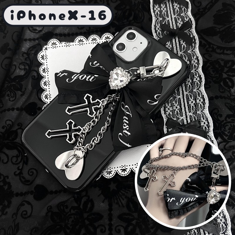 地雷系 スマホケース 黒 十字架 リボン ビジューハート ゴスロリータ キラキラ 姫系 病みかわ 夢かわ