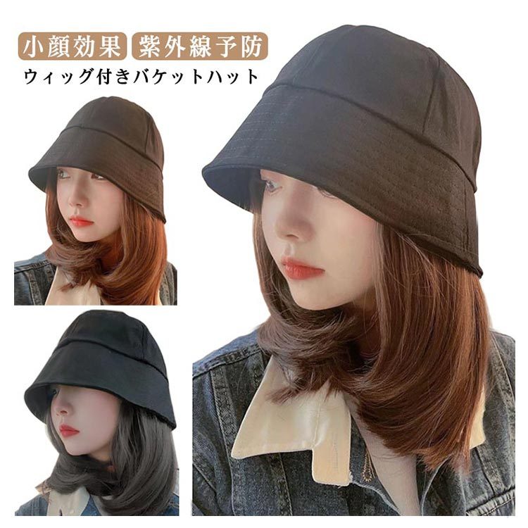 ウィッグ 付き 帽子 ストレート バケットハット ショートヘア ボブヘア 自然 髪 紫外線 予防 お出 かつら