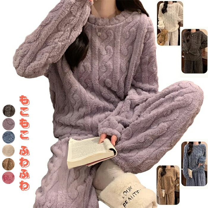 ルームウェア セットアップ レディース もこもこ ふわふわ あったか パジャマ フランネル 可愛い ケーブル柄 女性用 ホームウエア 上下セット 部屋着 室内着 長袖パジャマ 大人 保温 秋 冬 防寒