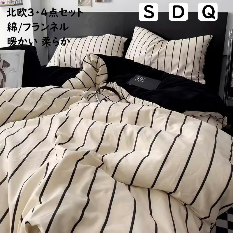 布団カバーセット ふんわり 暖かい 掛ふとんカバー3点セット 4点セット ストライプ 北欧 綿 フランネル シングル ダブル クイーン ins風 ボックスシーツ フラットシーツ 掛け布団 優しい肌触り