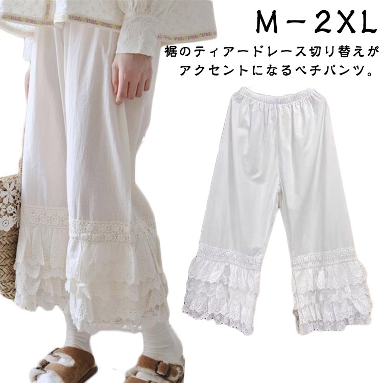 ティアード ペチパンツ ロング ペチコート レース 刺繡 パンツ インナー ボトムス レイヤード 重ね着 スカラップ刺繍 ガウチョ レディース ペチ ワイドパンツ ウエストゴム 薄手 白 体型カバー