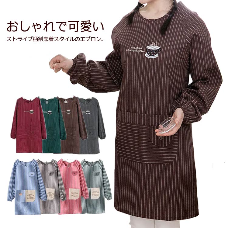 エプロン 長袖 割烹着 ポケット付き ストライプ柄 クルーネック ロング 作業エプロン 大人用 綿麻風 シンプル かっぽう着 ワンピース 汚れ防止 防水 防油 おしゃれ 料理用 介護 飲食店 保育士
