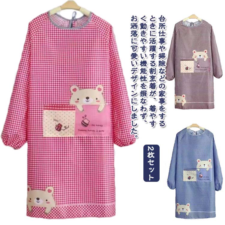 2枚セット 割烹着 おしゃれ エプロン 袖付き レディース かっぽう着 長袖 大人用 ロング丈 クマ柄 チェック ポケット付き 家事 キッチン 保育士 看護師 クッキング かわいい 飲食店