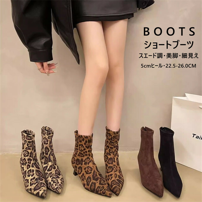 ショートブーツ レディース スエード調 ポインテッドトゥ チャンキーヒール ローヒール ヒョウ柄 ストレッチ 履きやすい 大人可愛い 美脚 細見え シューズ 滑りにくい おしゃれ きれいめ 疲れにくい
