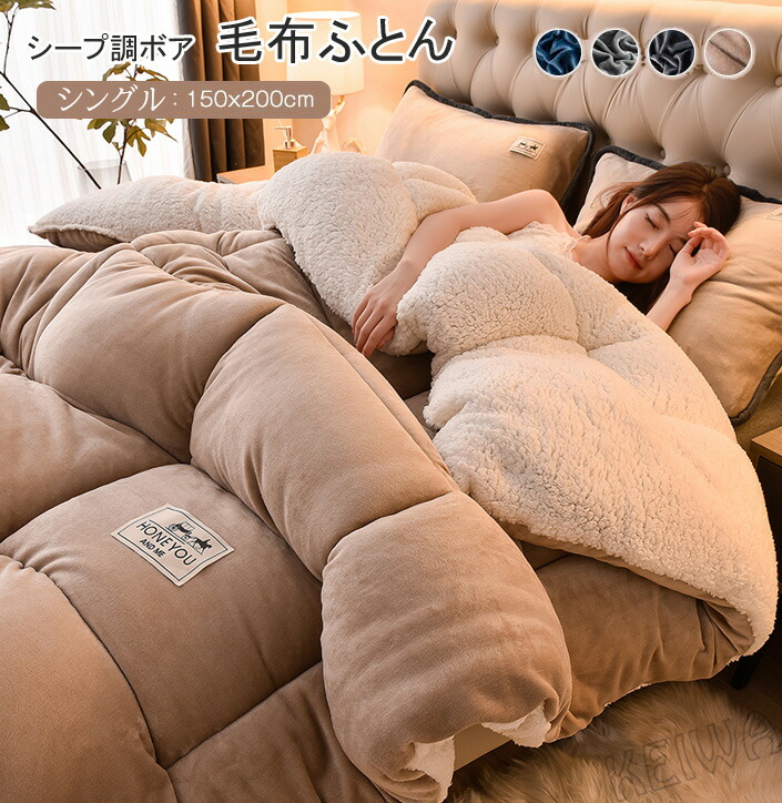 毛布布団 シープボア 掛け布団 シングル 2枚合わせ 中綿入り ボア フランネル 毛布ふとん 無地 厚手 ふわふわ あたたか おしゃれ 北欧 布団 ふとん 保温 冬 寝具 150X200cm 秋