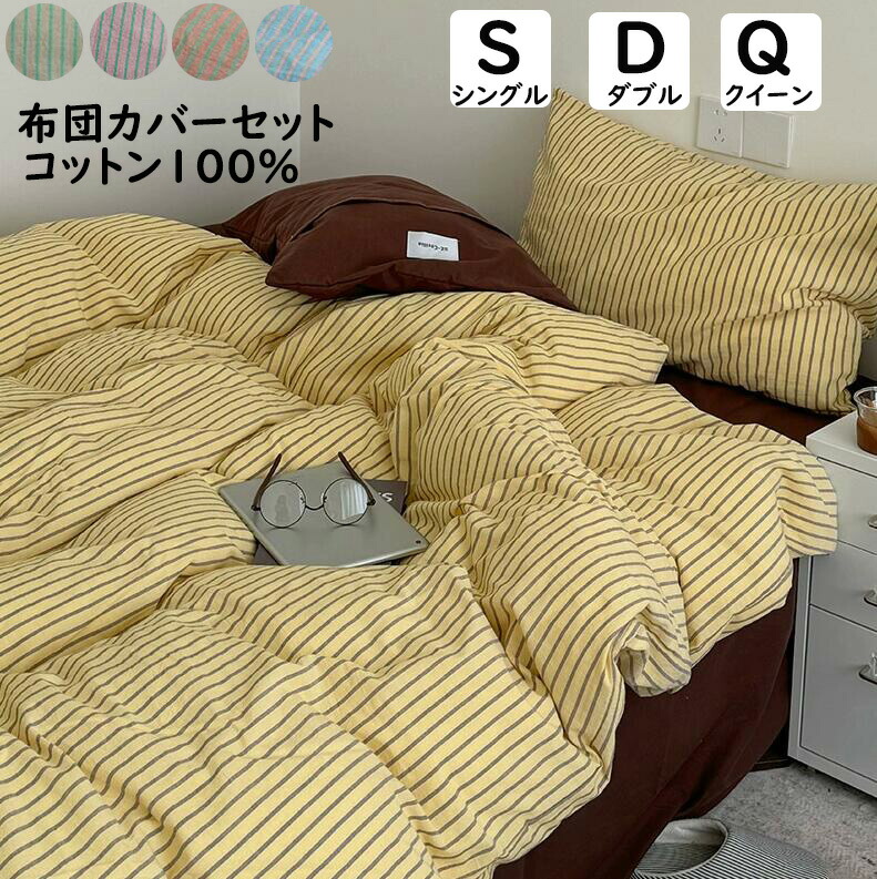 布団カバーセット ストライプ柄 ins風 綿100% 掛ふとんカバー 3点セット 4点セット シングル ダブル クイーン 優しい肌触り ボックスシーツ 掛け布団カバー 枕カバー 寝具カ フラットシーツ