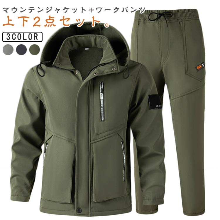 上下セット 撥水 メンズ マウンテンジャケット 防寒 ロングパンツ マウンテンパーカー ウインドブレーカー 裏起毛 防風 作業服 厚手 防水 ミリタリー ワークパンツ 登山服 カジ ジャケット