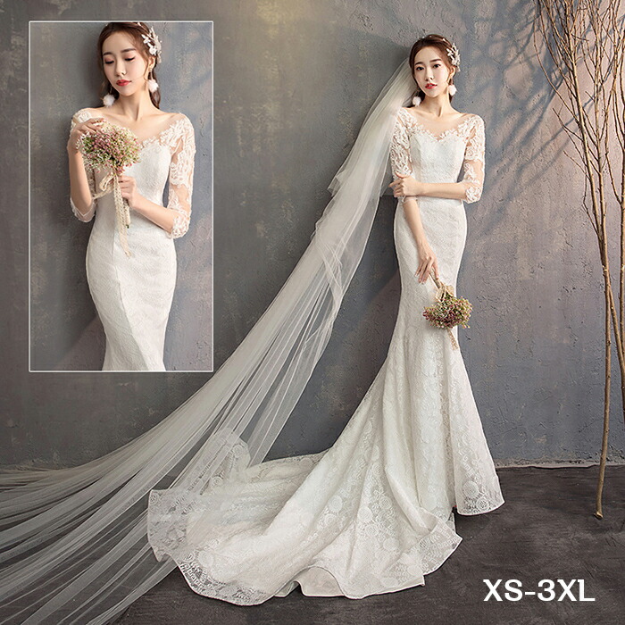 ウェディング ドレス マーメイド トレーン 五分袖 秋 冬 ウェディングドレス 花嫁ドレス 二次会ドレス 編み上げ 結婚式 二次会 マーメイドドレス 前撮り