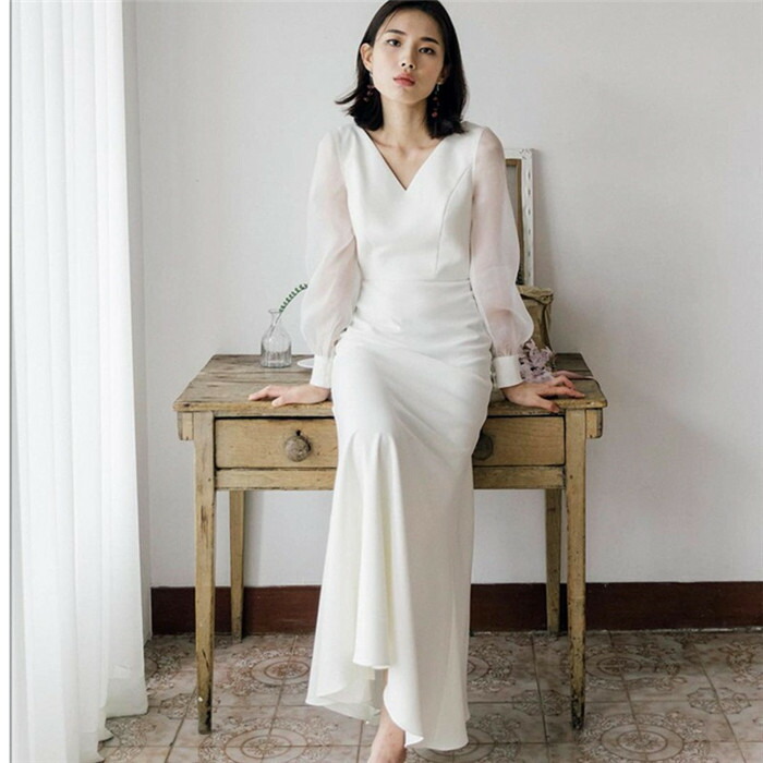 ウエディングドレス パーティードレス カジュアル ビーチフォト 前撮り 後撮り フォトウエディング 花嫁ドレス 長袖 シンプル ナチュラル 安い 撮影 海外挙式 披露宴 演奏会 発表会 パッド 結婚式