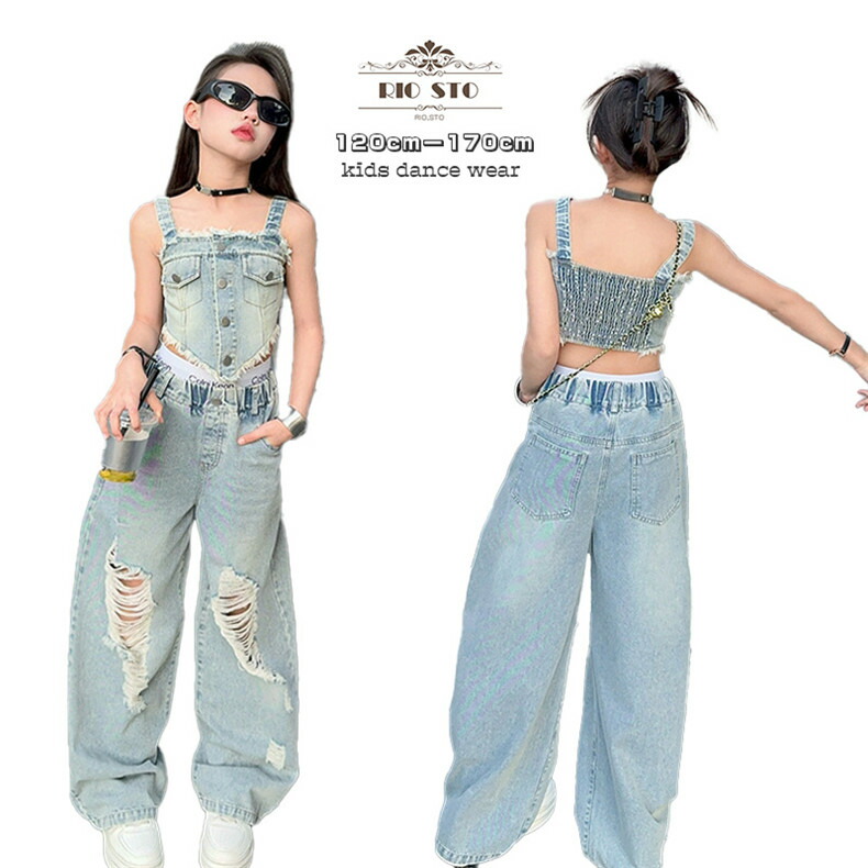 デニム ダンス衣装 ブルー 2点セット 女の子 ダメージパンツ タンクトップ 子供服 おしゃれ 演出服 hiphop ヒップホップ チームダンス 120-180cm キッズダンス