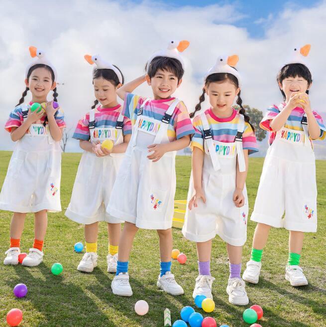子供 白サロペット カラフル 虹色Tシャツ オーバーオール ベビー服 オールインワン ボーダー柄Tシャツ 幼稚園 小学生 舞台演出服 男女兼用 可愛い 学園活動 サロペット 100-180 入学式