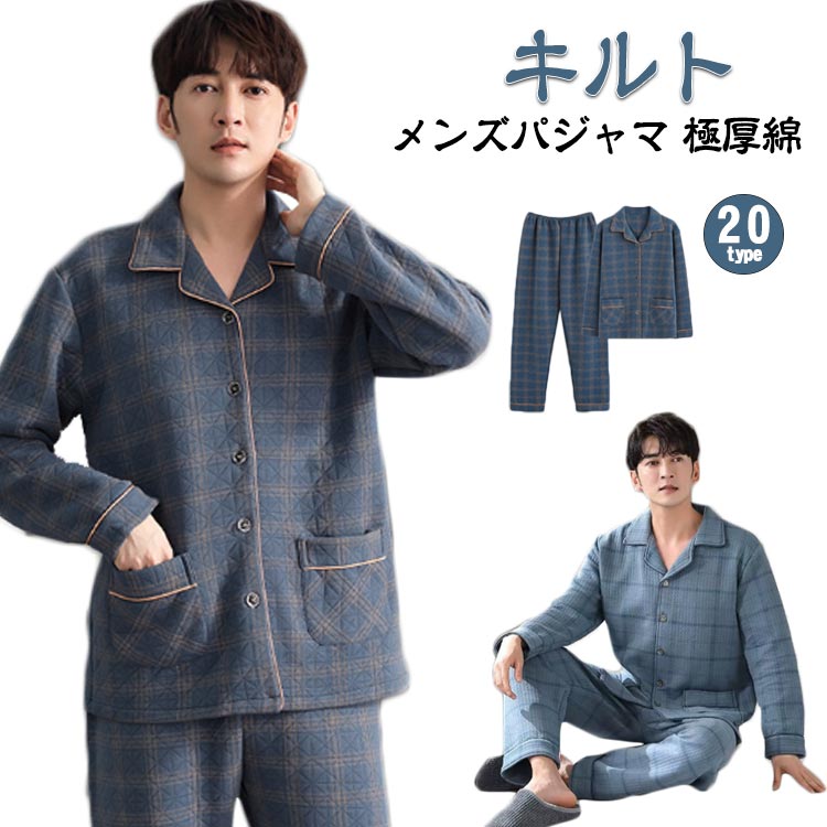 パジャマ メンズ 綿 キルト キルトニット 長袖 前開き 厚手 冬 上下セット ルームウェア ニットキルト 暖かい 冬用 無地 シンプル コットン 肌に優しい 春 秋 男性 大人 入院 紳士 部屋着