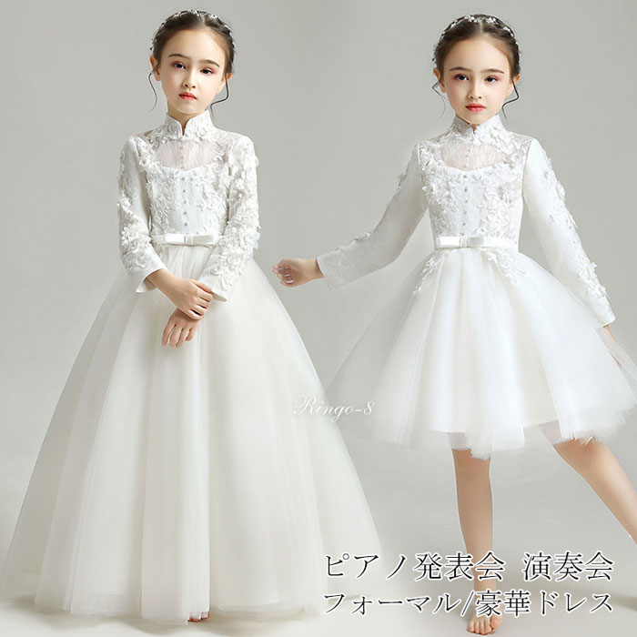 子供ドレス 長袖 ロングドレス 蝶結び 女の子 ジュニア ピアノ 発表会 パーディー 演奏会 フォーマル ドレス 入園式 結婚式 ワンピース 白 レースドレス 子供 100 1 チュールドレス