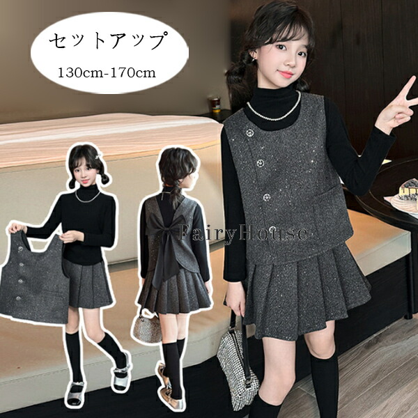 子供服 キッズ 女の子 セットアップ フォーマル 3点セット 発表会 記念日 イベント 誕生日 プレゼント ガールズ 黒シャツ+ベスト+スカート 上下セット 春着 秋着 冬着 通学着 おでかけ