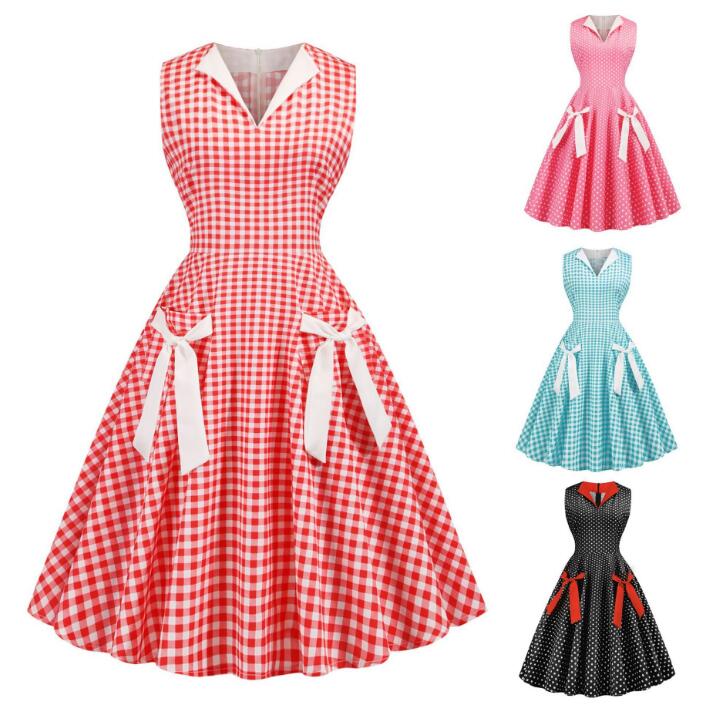 フランス風ワンピース レディース ドレス チェック柄 水玉柄 細身ドレス ノースリーブワンピース ミドル丈 舞台 演出服 パーティー衣装 団服 4色 S-XXL ステージ衣装