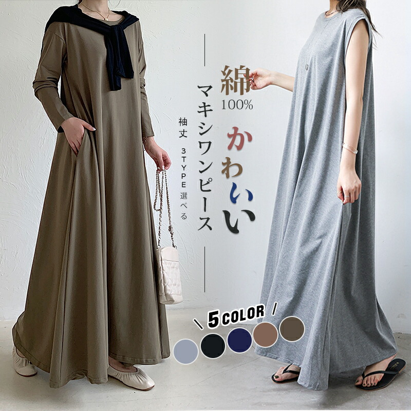 袖丈3TYPE選べる ワンピース 秋 レディース 長袖 半袖 ノースリーブ マキシワンピース Tシャツワンピース Uネック マキシ丈 フレア ワンピ 春 夏 ロング 春夏 きれい 冬