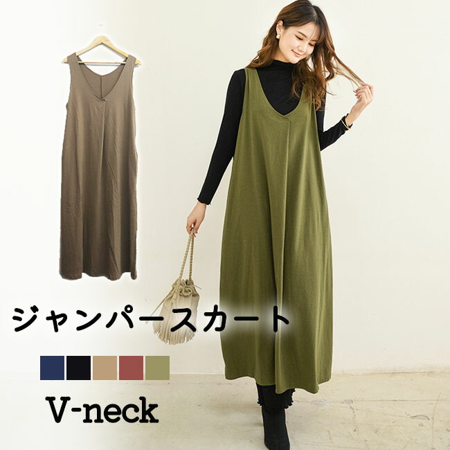 ジャンパースカート vネック レディース ロング丈 膝丈 ジャンスカ ワンピース ワンピ vネックワンピース Iライン ポケット ノースリーブ 無地 シンプル レイヤード風 きれいめ お洒 カジュアル