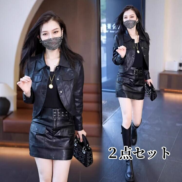 レザージャケット+スカート 上下2点セット レディース 革ジャン ショート丈 長袖 フェイクレザー 無地 ミニ タイトスカート 着痩せ お嬢様 大人 セクシー 脚長効果 セットアップファショ キレイめ