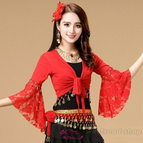 全8色 ベリーダンストップス レディース ベリーダンス衣装 レッスン着 練習着 ヒップスカーフチェーン キャミソール 7分袖羽織り フレアスリーブ 団体 舞台 社交ダンストップス パンコール キ 演出