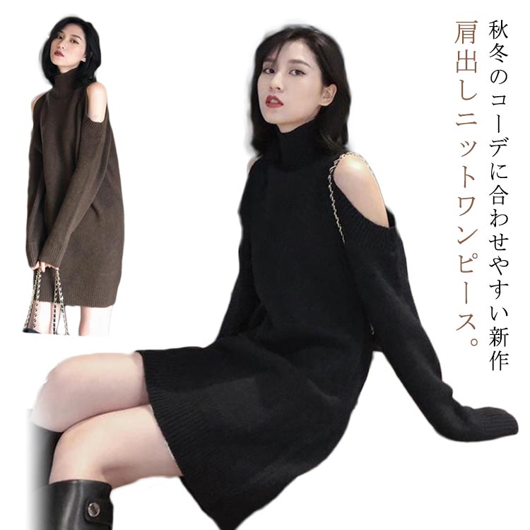 ニット ワンピース オフショルダー ミニ 秋冬 オープンショルダー ハイネック タートルネックニット メリヤス ニットワンピース 肩開き 肩あき 大きいサイズ 長袖 肌見せ 肩だし 韓国ファ セクシー