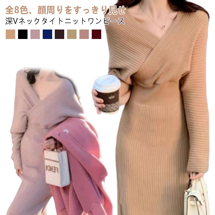 送料無料 ネック ニットワンピース ロング 秋冬 タイトワンピース ロングワンピース 深ネック エレガント フェミニン 上品 全8色 シンプル
