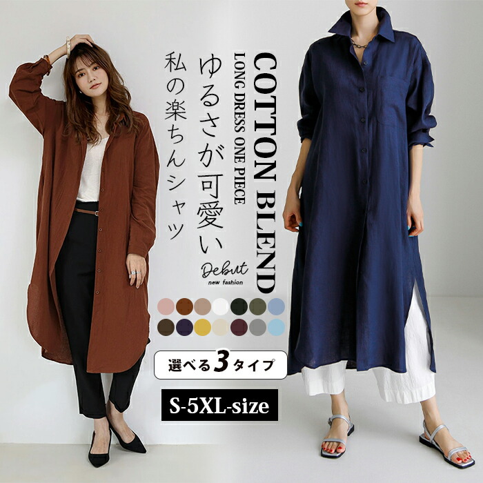 18%OFFクーポン シャツ ワンピース レディース 長袖 シャツワンピース ロング チュニック 3タイプ カーディガン ミモレ丈 トップス マキシワンピ ビッグシルエット フレアワンピ 体型カバー