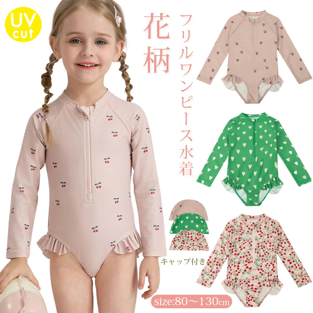 キッズ 水着 女の子 ワンピース 子供 ベビー水着 フリル UVカット 女児 オールインワン 長袖ラッシュガード ハート チェリー いちご 子供水着 こども 子供服 かわいい フラワー みずぎ