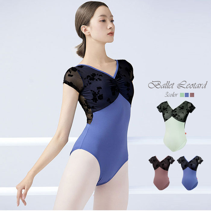 バレエ レオタード 大人 ジュニア 花柄 ベロア 切替 半袖 スカートなし エレガント Vネック 大人バレエ バレエ用品 レッスン 大人用 バレエレオタード 可 着