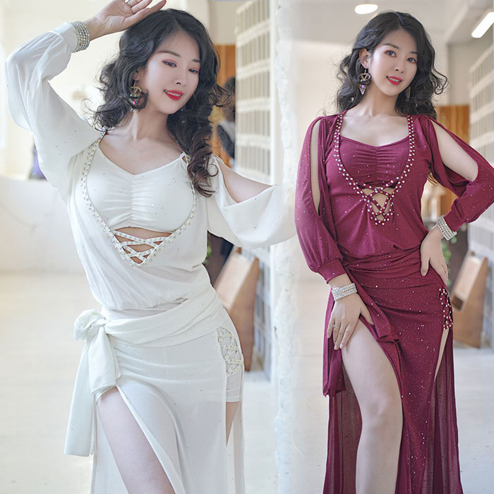 ベリーダンス衣装 ロング丈 ワンピース おしゃれ ストーン付きデザイン 星屑 キラキラ ベリーダンス 衣装 ダンス 長袖 スリット入り 舞 レッスン着