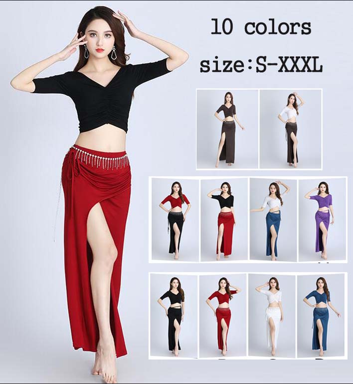 ベリーダンス衣装 ベリー 演出服 スパンコール付き キラキラ スカートセット フレア袖 へそ出しTシャツ スリット入り レッスン着 練習着 ダンス教室 ダンス団体服 ステージ 舞台衣装