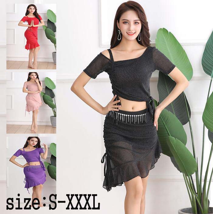 ベリーダンス 衣装 セット レッスン着 セットアップ おしゃれ ダンス衣装 ストレッチ メッシュ ラメ パンツ スカート トップス 非対称のネックライン 衣装セット ダンス 発 かわいい