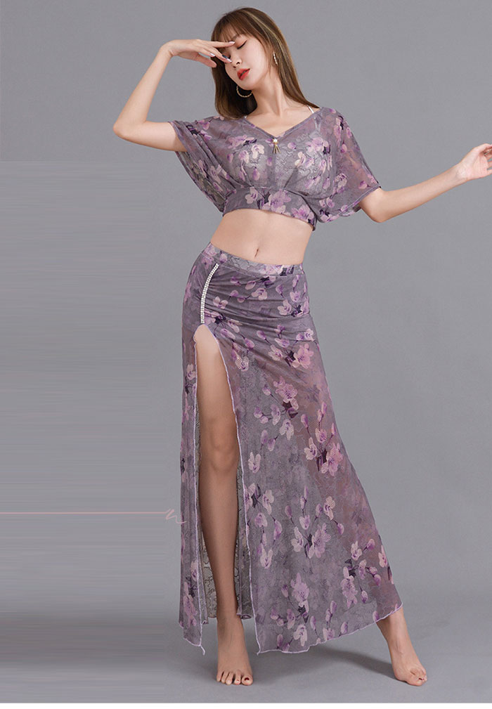 ベリーダンス 衣装 セット レッスン着 セットアップ おしゃれ 花柄 スリットオーバー スカート ロング丈 メッシュ プリント ダンス衣装 ステージ衣装 ダンス 上下セット 半袖 Vネッ 発表会