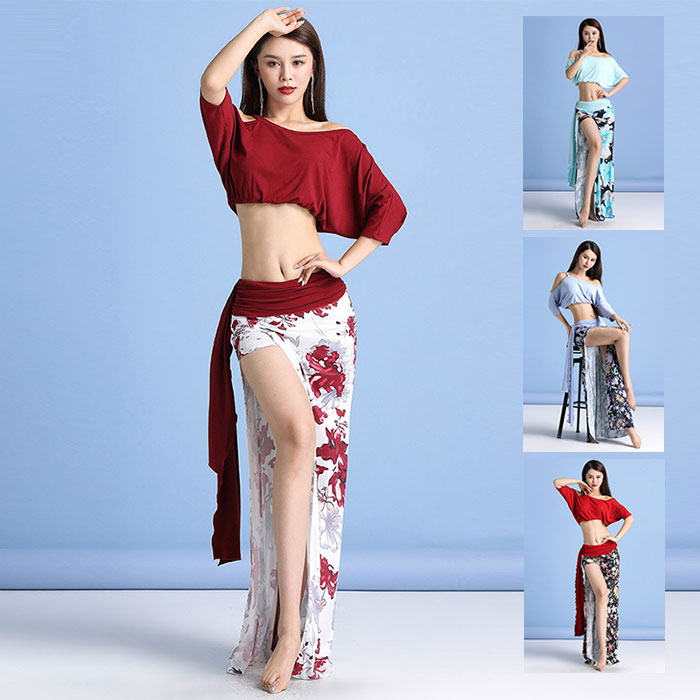 ベリーダンス衣装 セットアップ 2点セット ドルマン トップス 花柄 スカート ヒップスカーフ 秋冬 ダンス レッスン着 練習着 衣装 セット レッスンウェア レディース 社交ダンス ス ダンスウェア