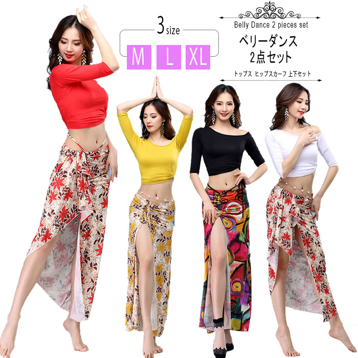 ベリーダンス 衣装 セット レッスン着 セットアップ ヒップスカーフ スカート シンプル 無地 ストレッチ コットン トップス セクシー おしゃれ ダンス衣装 ダンス 発表会 上下セット ステージ衣装