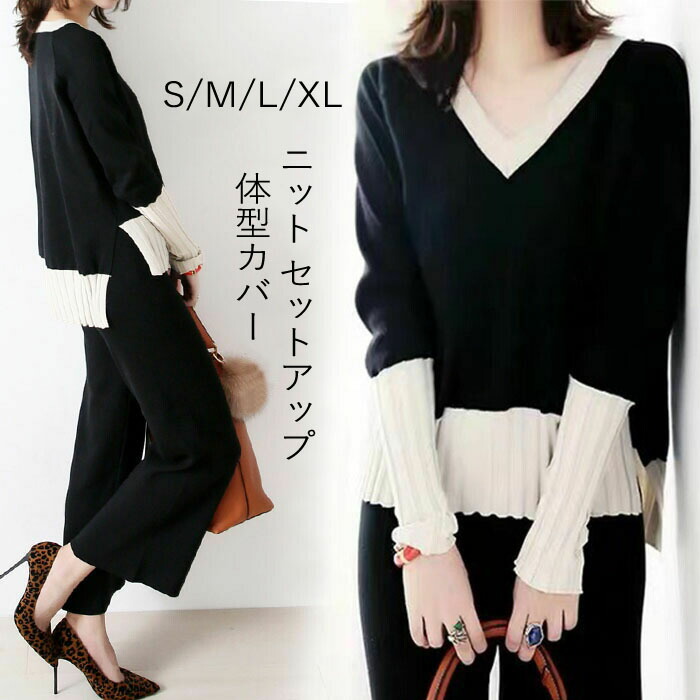 セットアップ レディース 秋冬 ニット 2点セット 秋冬ニット 秋冬セット パンツスーツ ニットセット セーター カットソー パンツ パッチワーク リブ切替 通勤 ol 女性 カジュアル
