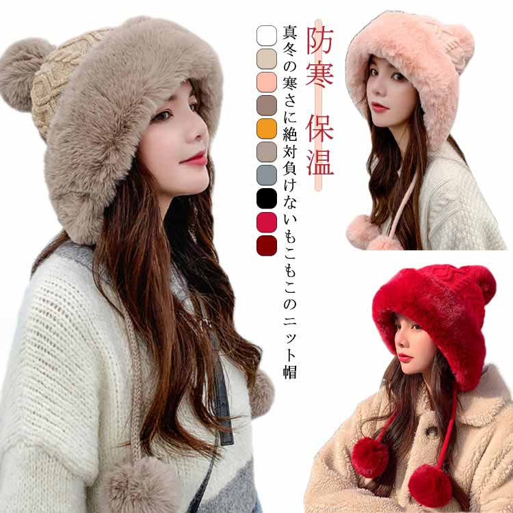あったか もこもこ 帽子 ファー付き ポンポン ニット帽 かわいい 秋冬 冬 レディース ガーリー 耳あて シンプル 無地 防寒 保温 暖かい 寒さ対策 ケーブル編み おしゃれ カジュアル ナ 伸縮性