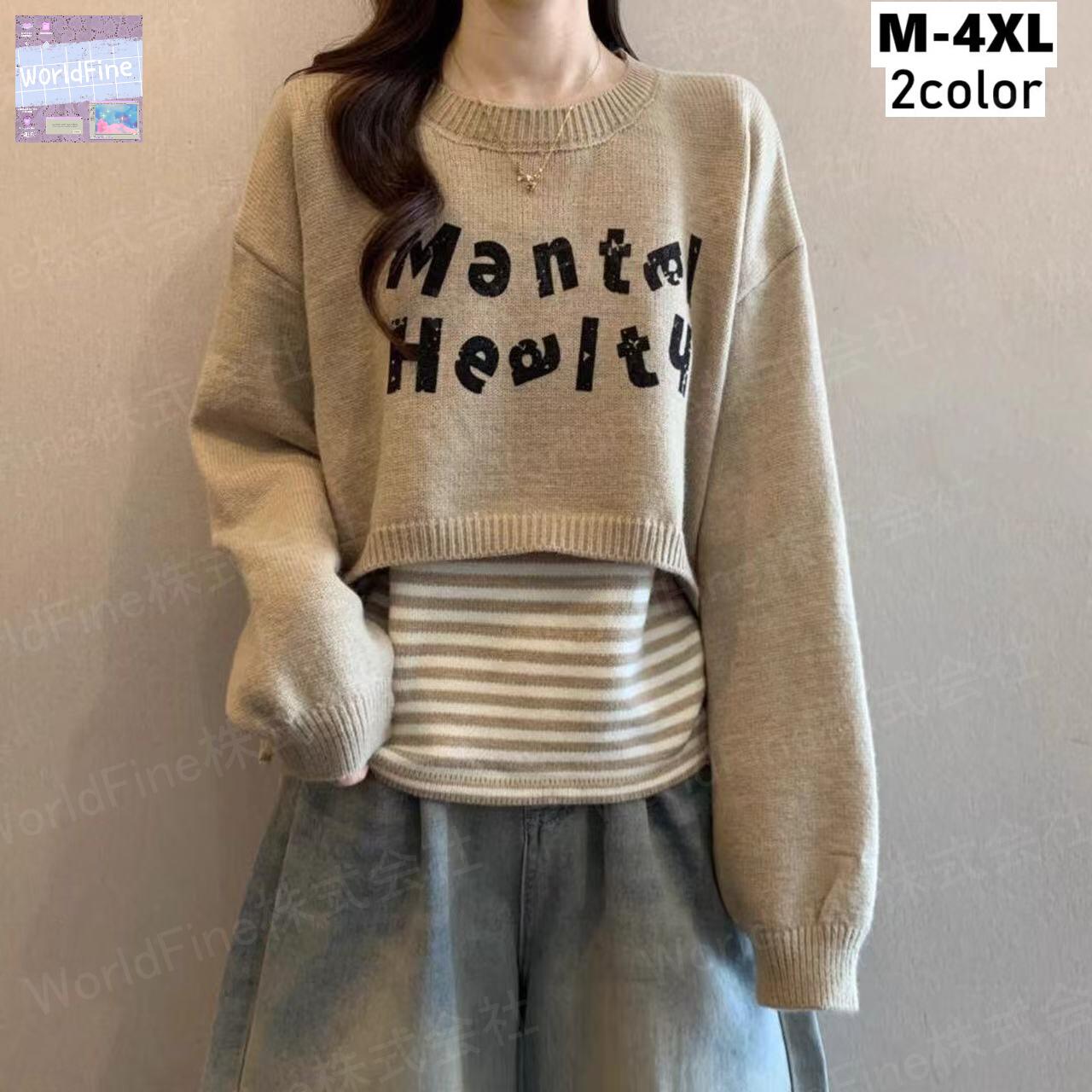 ニットセットアップ セーター レディース 長袖 丸首 重ね着風 トップス ニットセーター おしゃれ きれいめ 秋冬 春秋 きれいめニット 可愛いセーター レディースセーター ニットプルオーバー 英文字