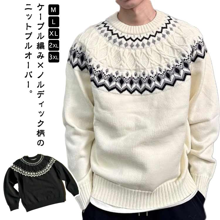 メンズ クルーネック セーター ニット ニットプルオーバー ケーブル編み 長袖 プルオーバー ニットセーター ゆったり オーバーサイズ 秋 冬 ニットトップス ノルディック柄 おしゃれ 大人 求心柄