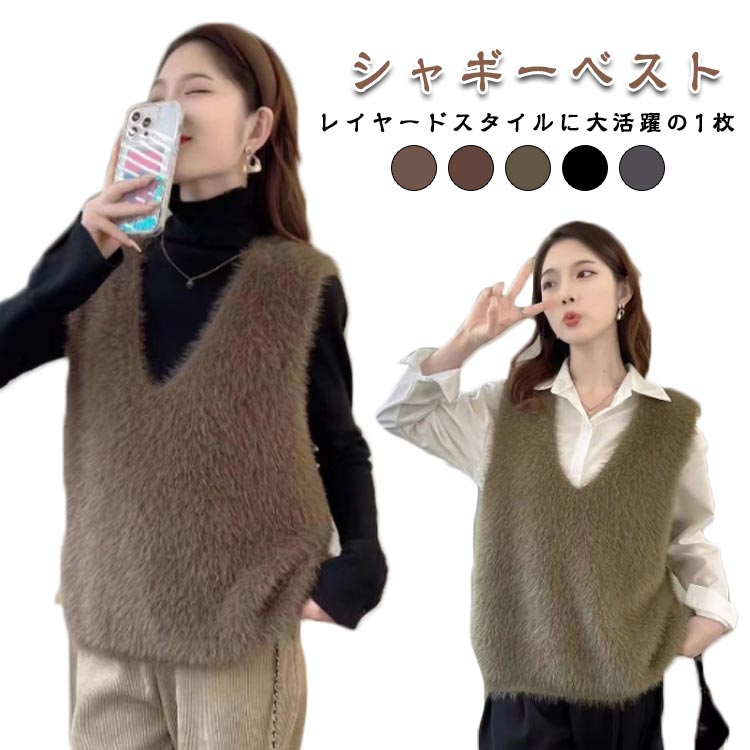 シャギーニット Vネック ニットベスト レディース ベスト ニット シャギー 暖か シャギーベスト 秋 冬 トレンド レイヤード トップス 毛足長め セーター ノースリーブ お プルオーバー